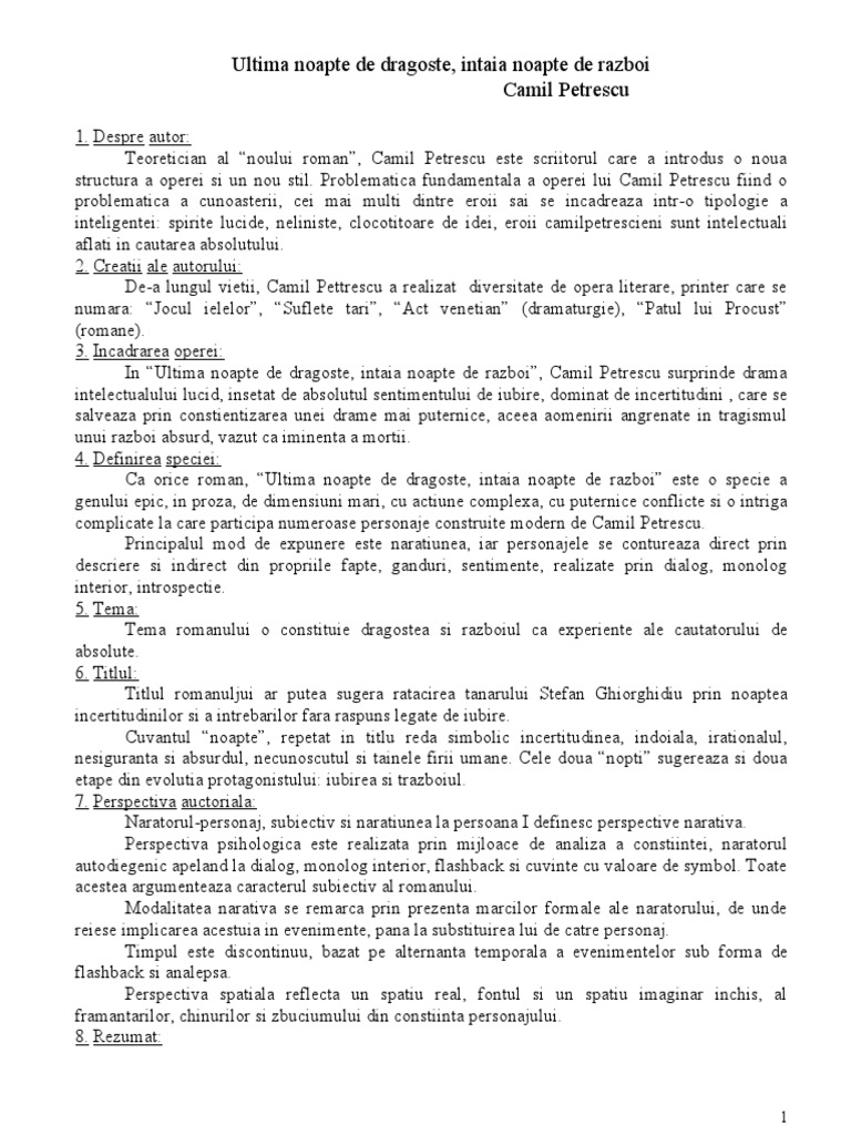 51333772 Rezumat Pe Capitole Ultima Noapte De Dragoste Intaia Noapte De Razboi Pdf Document Source from : https://vdocuments.site/51333772-rezumat-pe-capitole-ultima-noapte-de-dragoste-intaia-noapte-de-razboi.html „ultima noapte de dragoste, întâia noapte de război, romanul interbelic, modern, subiectiv și de analiză psihologică este compus din două părți conform jurnalului său de campanie, protagonistul face referiri la sistemul militar de apărare al țării care lasă de dorit, în special în preajma primului. Camil petrescu, ultima noapte de dragoste, întâia noapte de război. 5 cei doi unchi ai lui stefan gheorgidiu se numesc nae si tache. .noapte de dragoste, intaia noapte de razboi1*, de camil petrescu, ar putea fi caracterizata prin mai multe trasaturi: Domnule sublocotenent, la noapte compania noastra da trei posturi!
